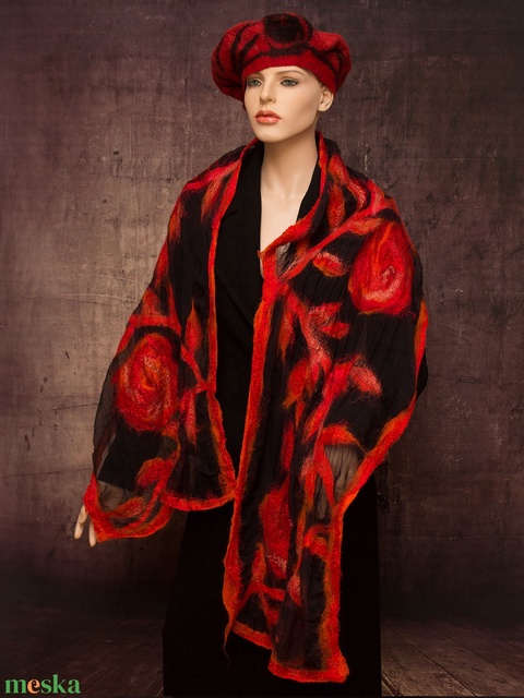 selyemre nemezelt piros rózsás stóla