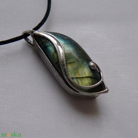 A medál Tiffany technikával készült labradorit és ólommentes, ezüsttartalmú ón felhasználásával. A díszítés szintén saját készítésű, nem tartalmaz gyári elemeket. A fémrészt óezüstre patináztam, lekezeltem antioxidánsal és lelakkoztam, hogy sokáig szép maradjon.
