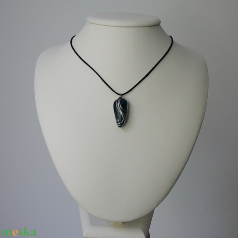 A medál tiffany technikával készült apatit és ólommentes, ezüsttartalmú ón felhasználásával. A díszítés szintén saját készítésű, nem tartalmaz gyári elemeket. A fémrészt óezüstre patináztam, lekezeltem antioxidánssal és lelakkoztam, hogy sokáig szép maradjon.