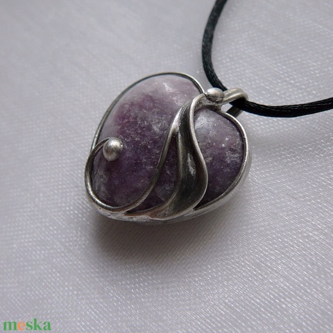 A medál tiffany technikával készült lepidolit és ólommentes, ezüsttartalmú ón felhasználásával. A díszítés szintén saját készítésű, nem tartalmaz gyári elemeket.A fémrészt óezüstre patináztam és lelakkoztam, hogy sokáig szép maradjon.