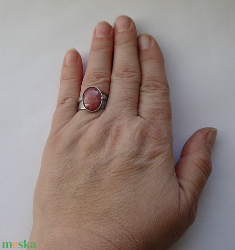 A gyűrű tiffany technikával készült rodokrozit és ólommentes, ezüsttartalmú ón felhasználásával. A díszítés szintén saját készítésű, nem tartalmaz gyári elemeket. A fémrészt óezüstre patináztam, lekezeltem antioxidánssal és lelakkoztam, hogy sokáig szép maradjon.