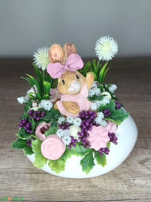 - Anyaga: műanyag zöldek, kerámia nyuszi, selyemvirág, kerámia virág, kerámia kaspó