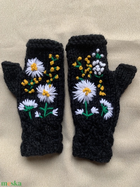Kesztyű, Kézi kötésű fekete ujjatlan kesztyű hímzett fehér és sárga virágokkal eladó