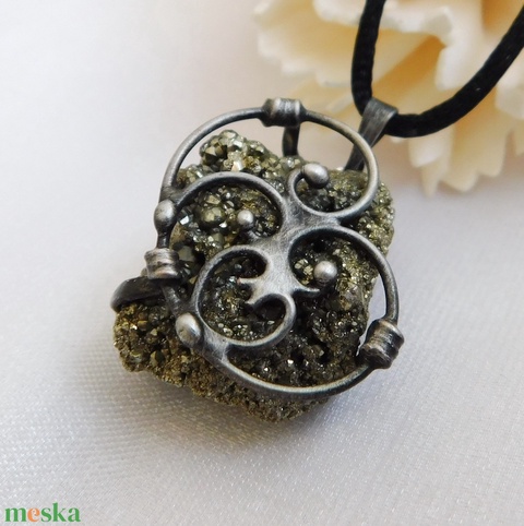A medál Tiffany technikával készült pirit és ólommentes, ezüsttartalmú ón felhasználásával. A díszítés szintén saját készítésű, nem tartalmaz gyári elemeket. A fémrészt óezüstre patináztam és lelakkoztam, hogy sokáig szép maradjon.