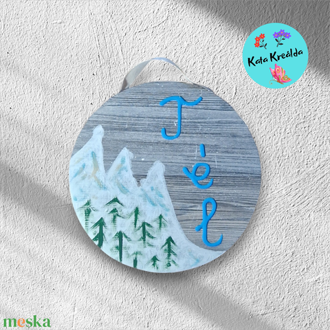 Téli táj 3. Kézzel festett, újrahasznosított laminált parkettára, ajtóra, polcra, falra.