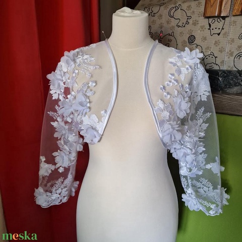 Kb. 2-3XL-es, 3D virágos, csipkés, hímzett hófehér menyasszonyi boleró
