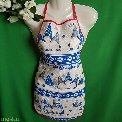 Karácsonyi manó mintás pamut konyhai kötény piros széllel