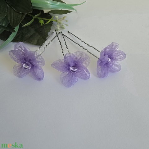 Áttetsző gyöngyös, lila színű tüll virágos hajtű, hajdísz