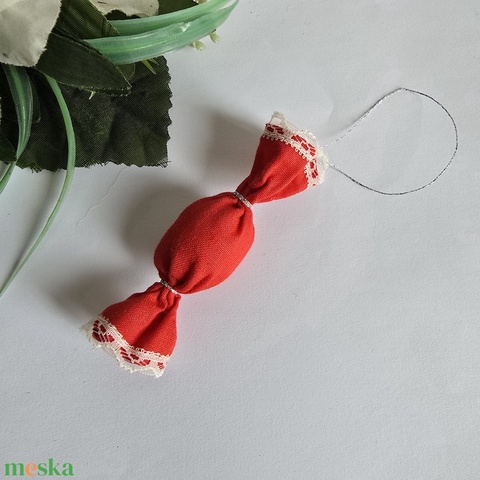 Piros színű textil szaloncukor karácsonyfadísz, karácsonyi dekoráció