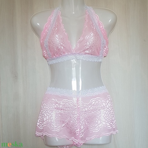 Rózsaszín-fehér színű csipke fehérnemű szett: melltartó + francia bugyi