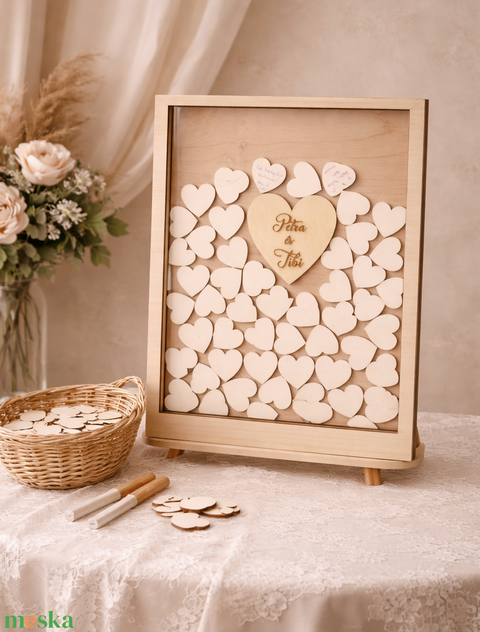 Bedobós szivecskés plexi tábla gravírozott fa vendégkönyv, emlékkönyv