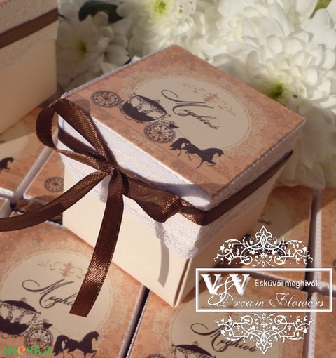 Dobozos esküvői meghívó hintós grafikával csipkével díszítve