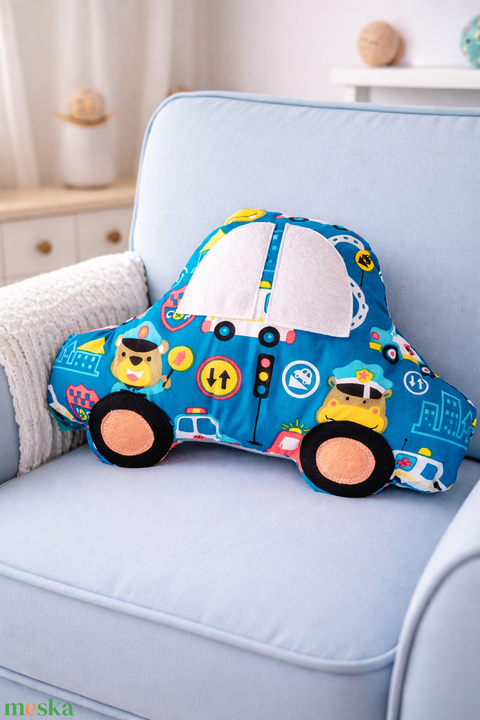 Autó formájú párna - Rendőrautó - macis autó -Autós díszpárna - Autó párna - Textiljáték - Textilfigura