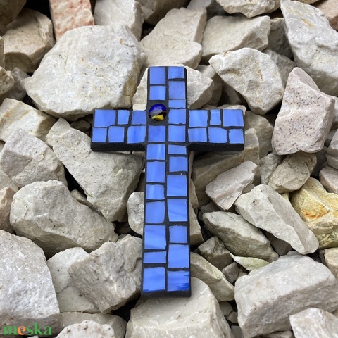 Pici mozaik kereszt - kék üvegmozaik, 11 cm