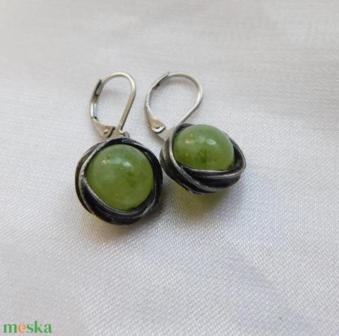 A fülbevaló tiffany technikával készült jáde olivin, réz és ólommentes, ezüsttartalmú ón felhasználásával. A díszítés szintén saját készítésű, nem tartalmaz gyári elemeket. A díszítés szintén saját készítésű, nem tartalmaz gyári elemeket.A fémrészt óezüstre patináztam és lelakkoztam, hogy sokáig szép maradjon.
