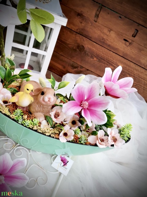 Csónak dekoráció, Selyemvirág asztaldísz , Magnólia tál