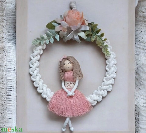 - Anyaga: makramé fonal, fa golyó, fém karika, selyemvirág