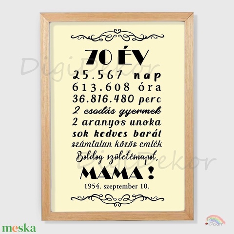 Krémszínű hátterű, egyedi falikép 70. születésnapra. Feliratos ajándék Mamának, Papának. Keretes falikép.