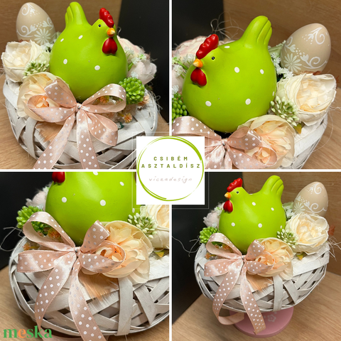 Csibés, dísz tojásos asztaldísz fonott kosárkában