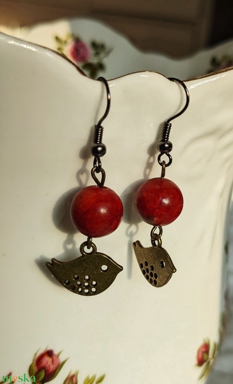- Anyaga: sárgaréz madár, terrakotta színű gyöngy, ékszerszerelék