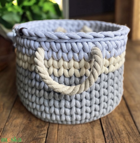 Nagyméretű horgolt kosár, kötél füllel - szürke, ekrü