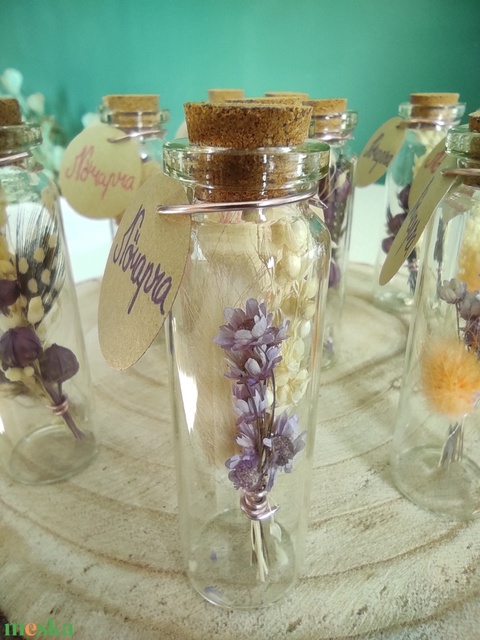 - Anyaga: üveg, szárazvirág, díszdrót, feliratoskártya