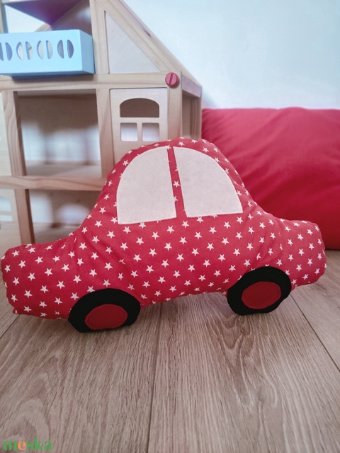 Autó formájú párna - piros csillagos autó - Autós díszpárna - Autó párna - Textiljáték - Textilfigura