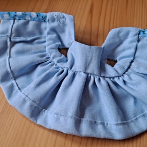 15cm magas bàjos kèk picurka baba.Minden zsebben ès tàskàban is elfèr.A test calico pamut anyag bòl kèszūlt a ruha 80%pamut 20% polièszter. A ruha levehető.