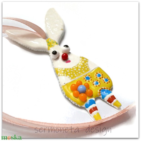 Bohókás nagyfülű nyúl olvasztott üvegből, húsvéti dísz, szalaggal felakasztható dísz