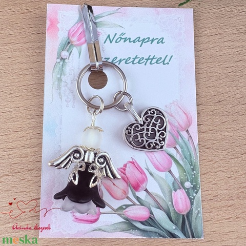Nőnapi ajándék szerencse fekete-fehér angyala kulcstartó ajándékkártyával választható medállal szív angyal angyalszárny