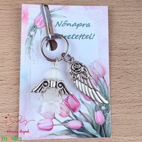 Nőnapi ajándék jóság fehér angyala kulcstartó ajándékkártyával választható medállal szív angyal angyalszárny