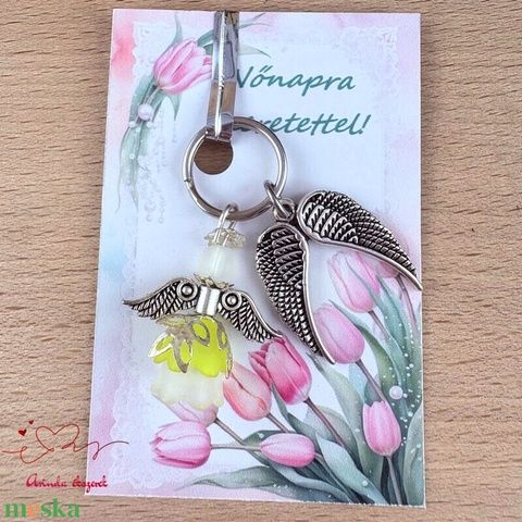 Nőnapi ajándék tudatosság sárga angyala kulcstartó ajándékkártyával választható medállal szív angyal angyalszárny