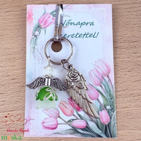 Nőnapi ajándék ambíció sötétzöld angyala kulcstartó ajándékkártyával választható medállal szív angyal angyalszárny