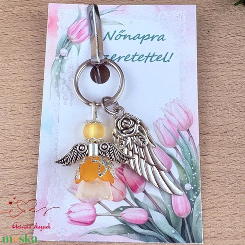 Nőnapi ajándék megvilágosodás narancs angyala kulcstartó ajándékkártyával választható medállal szív angyal angyalszárny