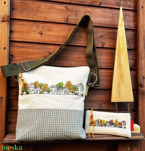 Házikók- hímzett táska és neszesszer SZETT- vastag erős kendervászon és vászon anyag.