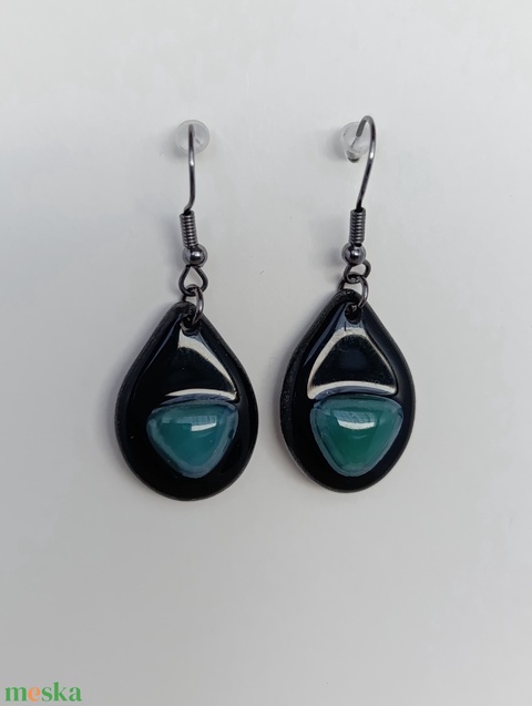 Csepp alakú fekete lógó fülbevaló türkiz pöttyel