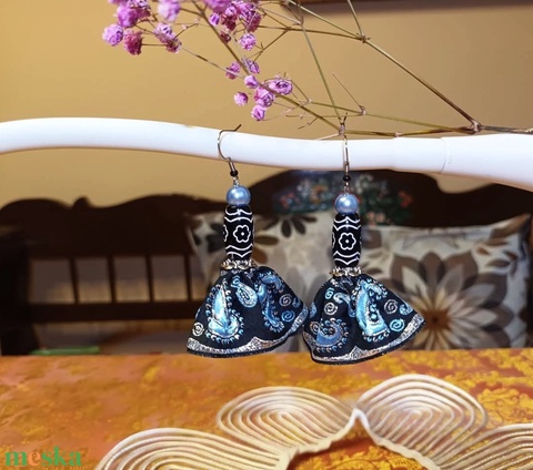 - Anyaga: hímzett szövet, akril gyöngy, tekla gyöngy, fém szerelékek