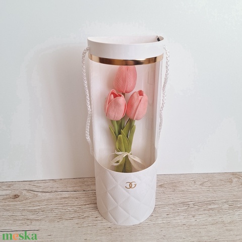 Élethű tulipánok virág táskában-lazac