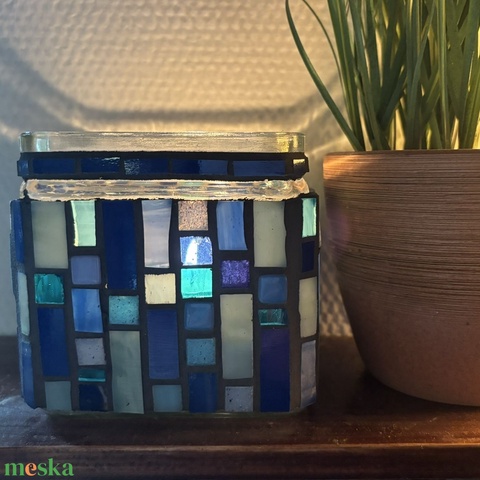 üvegváza, üveglapok, üvegmozaik darabok, üvegkavicsok, ragasztók, fúga, üveg