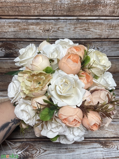 Örök menyasszonyi csokor vőlegény kitűzővel - barack-fehér