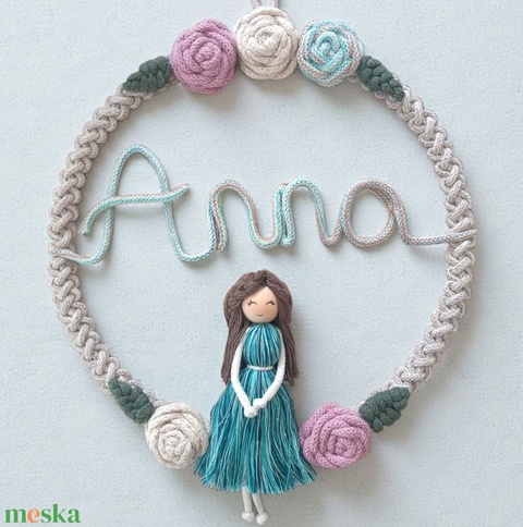 Makramé névtábla gyerekszobába – virágos karika névvel + makramé babával