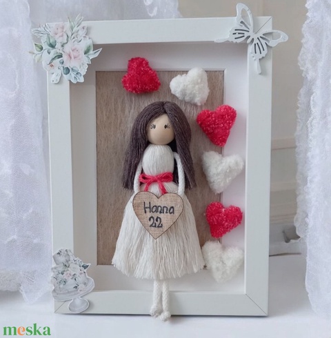 Születésnapi makramé baba dekoráció – névvel és évszámmal, fehér keretben