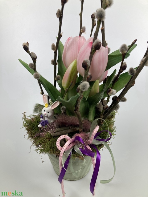 Pasztell rózsaszín tulipános, mohaágyon nyugvó, tartós virágdísz bájos nyuszi figurával és egy fürjtojással(S-07)