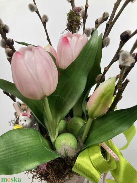Pinka Tulipánka - mohaágyon nyugvó, tartós virágdísz kerámia nyuszi figurával, fürjtojásokkal (S-09)