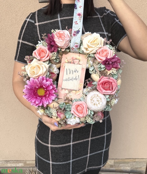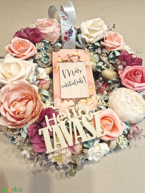 koszorú alapot, selyemvirág, szalag, kenderzsinór, fa felirat
