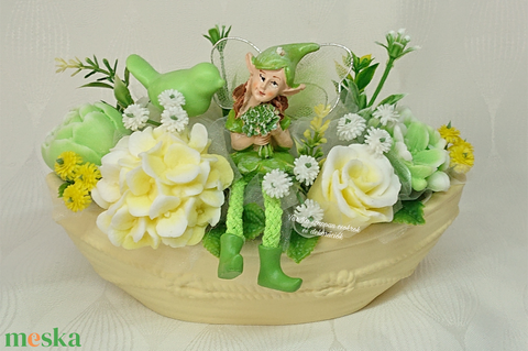Tündéres szappanvirág csokor csónak alakú kaspóban