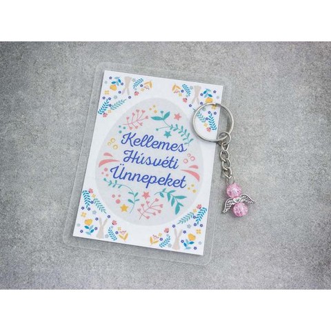 Húsvéti kulcstartó rózsaszín üveg angyal medállal és üdvözlőkártyávalLeírás:Ez a különleges húsvéti kulcstartó egy bájos és jelentéssel teli ajándék, amely a szeretetet, a harmóniát és a gyengédséget szimbolizálja. A kulcstartón egy rózsaszín üveg gyöngyökből készült angyal medál található, amelyet ezüstszínű angyalszárnyak egészítenek ki. A kulcstartóhoz egy laminált húsvéti üdvözlőkártya is tartozik, amely a „Kellemes Húsvéti Ünnepeket” felirattal ünnepi hangulatot teremt.A rózsaszín a szeretet, a gyengédség és az öröm szimbóluma, amely segíti az érzelmi harmóniát és a pozitív energiák áramlását. Az üveg medál különleges csillogása még egyedibbé teszi ezt a finom és elegáns ajándékot, amely minden korosztály számára tökéletes választás lehet.Termékjellemzők:Rózsaszín üveg gyöngyökből készült angyal medálEzüstszínű angyalszárnyak, elegáns és klasszikus megjelenésselLaminált húsvéti üdvözlőkártya tavaszi mintával és ünnepi üzenettelKompakt méret, amely könnyen hordozható és stílusos kiegészítőként használhatóTartós és minőségi kivitel, amely hosszú távon megőrzi szépségétMiért érdemes ezt választani?A rózsaszín üveg a szeretet és a harmónia szimbólumaAz angyal medál védelmet és pozitív energiát közvetítEgyedi, személyes ajándék húsvétra és más különleges alkalmakraPraktikus kulcstartóként vagy táskadíszként is használhatóElegáns és időtálló ajándék minden korosztály számáraGyakran Ismételt Kérdések (GYIK):Milyen anyagból készült a medál?A medál csiszolt rózsaszín üveg gyöngyökből áll, amelyet fém angyalszárnyak egészítenek ki.Mekkora a kulcstartó mérete?A medál mérete körülbelül 30x20 mm, az üdvözlőkártya pedig 110×80 mm.Milyen alkalmakra ajánlott?Ez a kulcstartó ideális húsvéti ajándékként, de tökéletes választás lehet születésnapra, névnapra vagy más különleges alkalmakra is.Ez a rózsaszín üveg angyalkás kulcstartó és húsvéti üdvözlőkártya szett egy finom, meghitt és jelentéssel teli ajándék, amely szeretetet, harmóniát és ünnepi hangulatot sugároz.