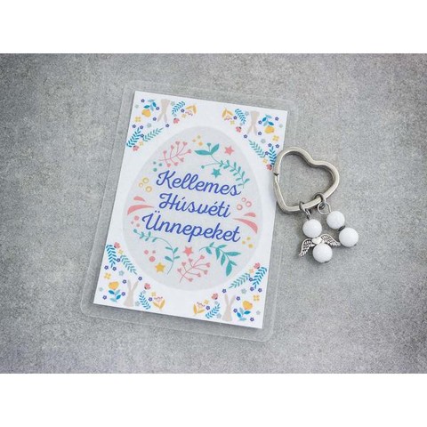 Húsvéti kulcstartó tejkvarc angyal medállal és üdvözlőkártyávalLeírás:Ez a különleges húsvéti kulcstartó egy elegáns és jelentéssel teli ajándék, amely a tisztaságot, a belső békét és a védelmet szimbolizálja. A kulcstartón egy tejkvarc ásványgyöngyökből készült angyal medál található, amelyet ezüstszínű angyalszárnyak egészítenek ki. A kulcstartó szív alakú karikával rendelkezik, amely még különlegesebbé teszi ezt a finom kiegészítőt. A szett részét képezi egy laminált húsvéti üdvözlőkártya, amely a „Kellemes Húsvéti Ünnepeket” felirattal ünnepi hangulatot teremt.A tejkvarc az ártatlanság és a belső harmónia köve, amely segíti a lelki nyugalom megtalálását és tisztaságot sugároz. Ez a kulcstartó nemcsak dekoratív kiegészítő, hanem egy kis védelmező szimbólum is lehet a mindennapokban.Termékjellemzők:Természetes tejkvarc ásványgyöngyökből készült angyal medálEzüstszínű angyalszárnyak, elegáns és klasszikus megjelenésselSzív alakú kulcstartó karika az extra jelentéstartalomértLaminált húsvéti üdvözlőkártya tavaszi mintával és ünnepi üzenettelKompakt méret, amely könnyen hordozható és stílusos kiegészítőként használhatóTartós és minőségi kivitel, amely hosszú távon megőrzi szépségétMiért érdemes ezt választani?A tejkvarc a tisztaság és a lelki egyensúly ásványaAz angyal medál védelmet és pozitív energiát közvetítA szív alakú kulcskarika az érzelmi kötődés és szeretet szimbólumaEgyedi, személyes ajándék húsvétra és más különleges alkalmakraPraktikus kulcstartóként vagy táskadíszként is használhatóElegáns és időtálló ajándék minden korosztály számáraGyakran Ismételt Kérdések (GYIK):Milyen anyagból készült a medál?A medál természetes tejkvarc ásványgyöngyökből áll, amelyet fém angyalszárnyak egészítenek ki.Mekkora a kulcstartó mérete?A medál mérete körülbelül 30x20 mm, az üdvözlőkártya pedig 110×80 mm.Milyen alkalmakra ajánlott?Ez a kulcstartó ideális húsvéti ajándékként, de tökéletes választás lehet születésnapra, névnapra vagy más különleges alkalmakra is.Ez a tejkvarc angyalkás kulcstartó és húsvéti üdvözlőkártya szett egy finom, meghitt és jelentéssel teli ajándék, amely békét, védelmet és ünnepi hangulatot sugároz.
