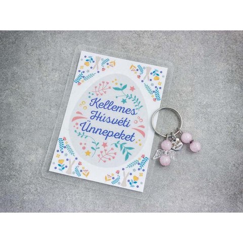 Húsvéti kulcstartó rózsakvarc angyal medállal, akril szárnnyal és üdvözlőkártyávalLeírás:Ez a különleges húsvéti kulcstartó nemcsak egy elegáns kiegészítő, hanem egy mély jelentéssel bíró ajándék is. A medál rózsakvarc ásványgyöngyökből készült angyal formában, amelyet áttetsző akril angyalszárnyak egészítenek ki. Az angyal mellett egy gravírozott charm is található, amely még egyedibbé és személyesebbé teszi ezt a kiegészítőt.A kulcstartóhoz egy szépen kidolgozott, laminált húsvéti üdvözlőkártya tartozik, amely a „Kellemes Húsvéti Ünnepeket” felirattal ünnepi hangulatot teremt. A rózsakvarc a szeretet, a harmónia és a belső béke köve, amely segít az érzelmek kiegyensúlyozásában és a pozitív energiák áramlásában. Az akril szárnyak finom, légies megjelenést biztosítanak, amely az angyali védelem és tisztaság szimbóluma.Ez a húsvéti kulcstartó tökéletes választás szeretteid számára, amely esztétikus és spirituális jelentéssel is bír.Termékjellemzők:Természetes rózsakvarc ásványgyöngyökből készült angyal medálÁttetsző akril angyalszárnyak, finom és modern dizájnnalGravírozott charm díszítés a kulcskarikánLaminált húsvéti üdvözlőkártya nyuszis és virágos mintávalKompakt méret, könnyen hordozható, stílusos kiegészítőMiért érdemes ezt választani?A rózsakvarc a szeretet, a harmónia és a nyugalom ásványaAz angyal medál a védelmet és a tisztaságot szimbolizáljaEgyedi, személyes ajándék húsvétra és más alkalmakra isPraktikus kulcstartóként vagy táskadíszként is használhatóElegáns és időtálló ajándék minden korosztály számáraGyakran Ismételt Kérdések (GYIK):Milyen anyagból készült a medál?A medál természetes rózsakvarc ásványgyöngyökből áll, amelyet áttetsző akril angyalszárnyak és egy gravírozott charm egészít ki.Mekkora a kulcstartó mérete?A medál mérete körülbelül 30x20 mm, az üdvözlőkártya pedig 110×80 mm.Milyen alkalmakra ajánlott?Ez a kulcstartó ideális húsvéti ajándékként, de tökéletes választás lehet születésnapra, névnapra vagy más különleges alkalmakra is.Ez a rózsakvarc angyalkás kulcstartó és húsvéti üdvözlőkártya szett egy finom, meghitt és jelentéssel teli ajándék, amely szeretetet, védelmet és meghitt ünnepi hangulatot sugároz.