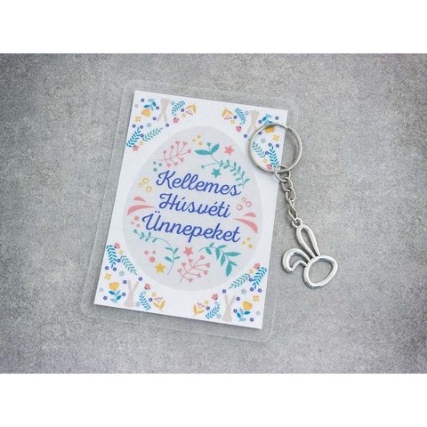 Húsvéti kulcstartó nyuszifüles fém medállal és üdvözlőkártyávalLeírás:Ez a vidám és stílusos húsvéti kulcstartó tökéletes ajándék húsvéti meglepetésként vagy tavaszi kiegészítőként. A kulcstartón egy minimalista, ezüstszínű nyuszifüles medál található, amely játékos és modern megjelenést kölcsönöz. A kulcstartóhoz egy laminált húsvéti üdvözlőkártya is tartozik, amely a „Kellemes Húsvéti Ünnepeket” felirattal ünnepi hangulatot teremt.A nyuszis szimbólum a szerencsét, az újjászületést és a tavasz vidámságát jelképezi. Letisztult, mégis játékos dizájnjának köszönhetően kiváló kiegészítő lehet mindennapi használatra vagy akár egyedi húsvéti ajándékként.Termékjellemzők:Ezüstszínű fém nyuszifüles medálLaminált húsvéti üdvözlőkártya tavaszi mintával és ünnepi üzenettelMinimalista és modern dizájn, amely minden stílushoz illikKompakt méret, amely könnyen hordozható és praktikus kiegészítőTartós és minőségi kivitel, amely hosszú távon megőrzi szépségétMiért érdemes ezt választani?Vidám és játékos húsvéti kiegészítőA nyuszifüles medál a szerencse és az újjászületés szimbólumaEgyedi, személyes ajándék húsvétra és tavaszi alkalmakraPraktikus kulcstartóként vagy táskadíszként is használhatóElegáns, mégis könnyed és fiatalos megjelenésGyakran Ismételt Kérdések (GYIK):Milyen anyagból készült a medál?A medál ezüstszínű fémből készült, letisztult, minimalista kialakítással.Mekkora a kulcstartó mérete?A medál mérete körülbelül 30x20 mm, az üdvözlőkártya pedig 110×80 mm.Milyen alkalmakra ajánlott?Ez a kulcstartó ideális húsvéti ajándékként, de kiváló meglepetés lehet tavaszi ünnepekre, születésnapokra vagy névnapokra is.Ez a nyuszifüles kulcstartó és húsvéti üdvözlőkártya szett egy vidám és elegáns ajándék, amely ünnepi hangulatot és szerencsét sugároz.